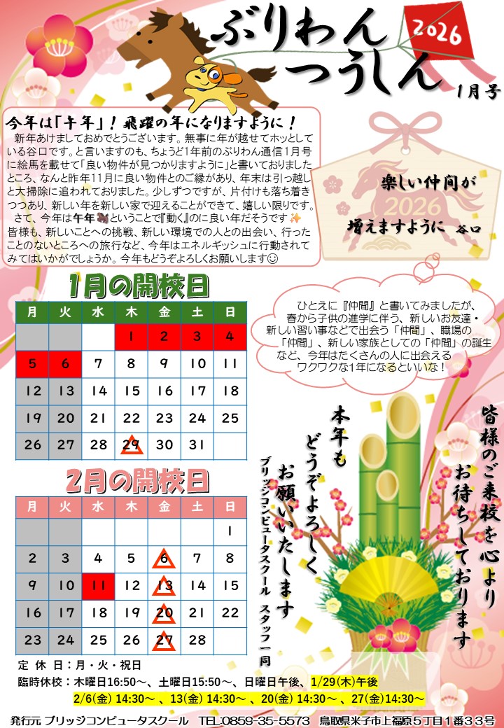 ブリッジコンピュータスクールの教室しんぶん、「ぶりわんつうしん」2026年新春月号を発刊しました!